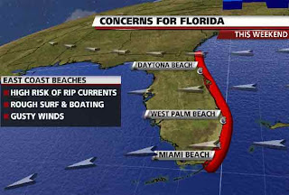 This weekend storms passing through the Atlantic were suppose to bring much needed rain to the Northeast. Unfortunately for Florida, this storm could cause damage and potentially be a flood warning. In the picture to the right, the East coast beaches are warned of rip currents, rough surfing and boating and gusty winds. (picture from http://beta.weather.com/outlook/weather-news/news/articles/poor-florida-weather-watching-tropics_2011-10-05)